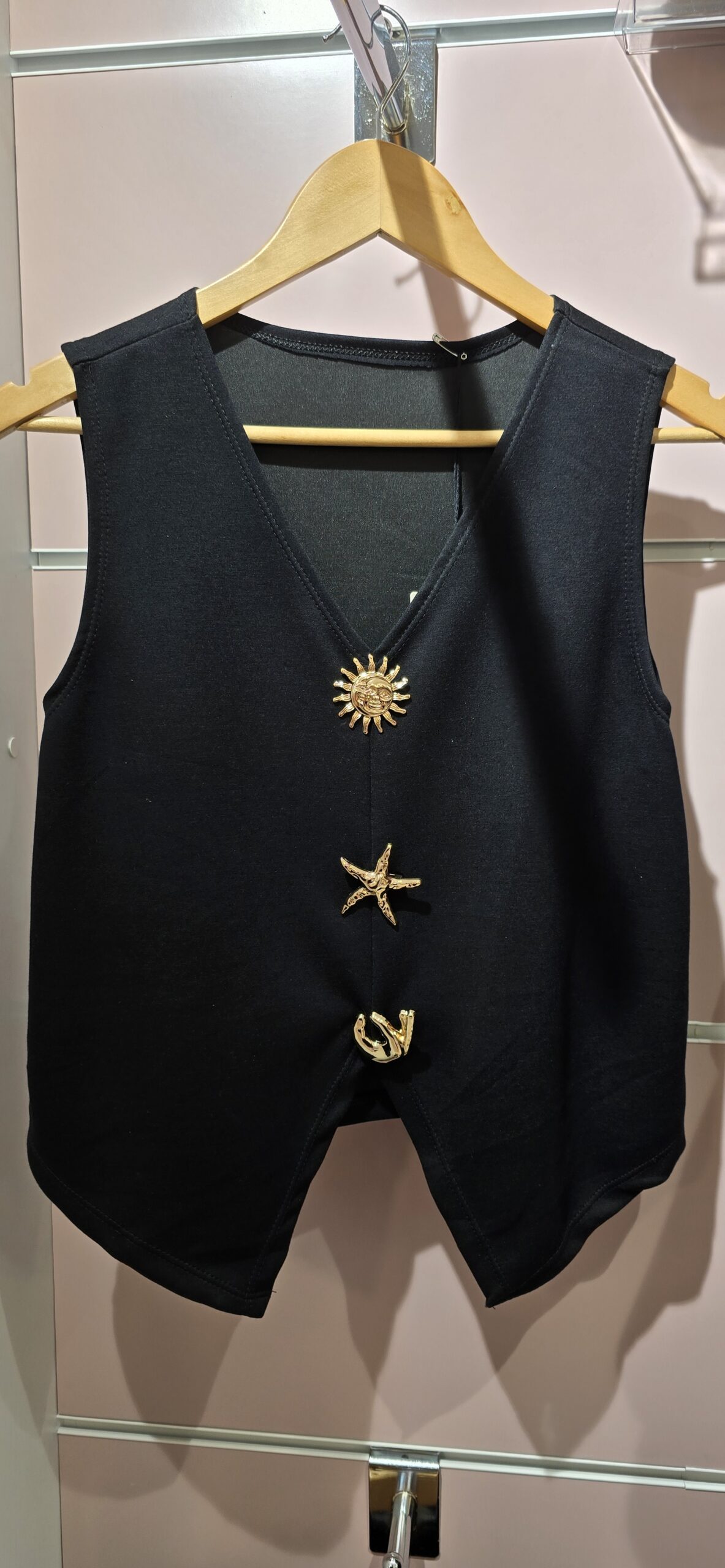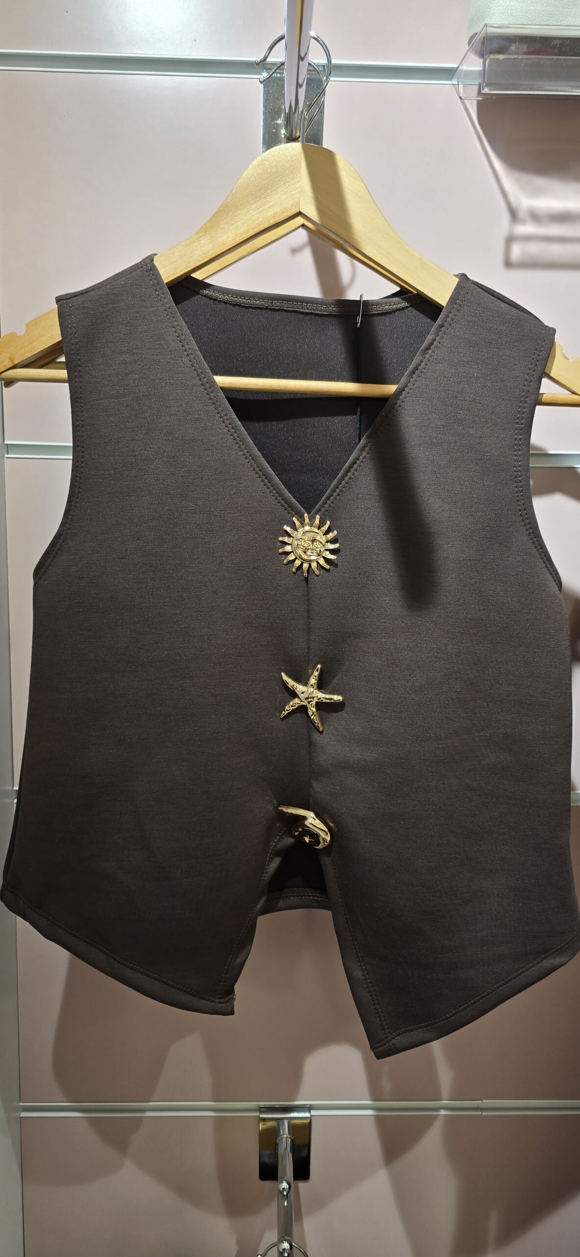 Chaleco cosido con broches de quita y pon.